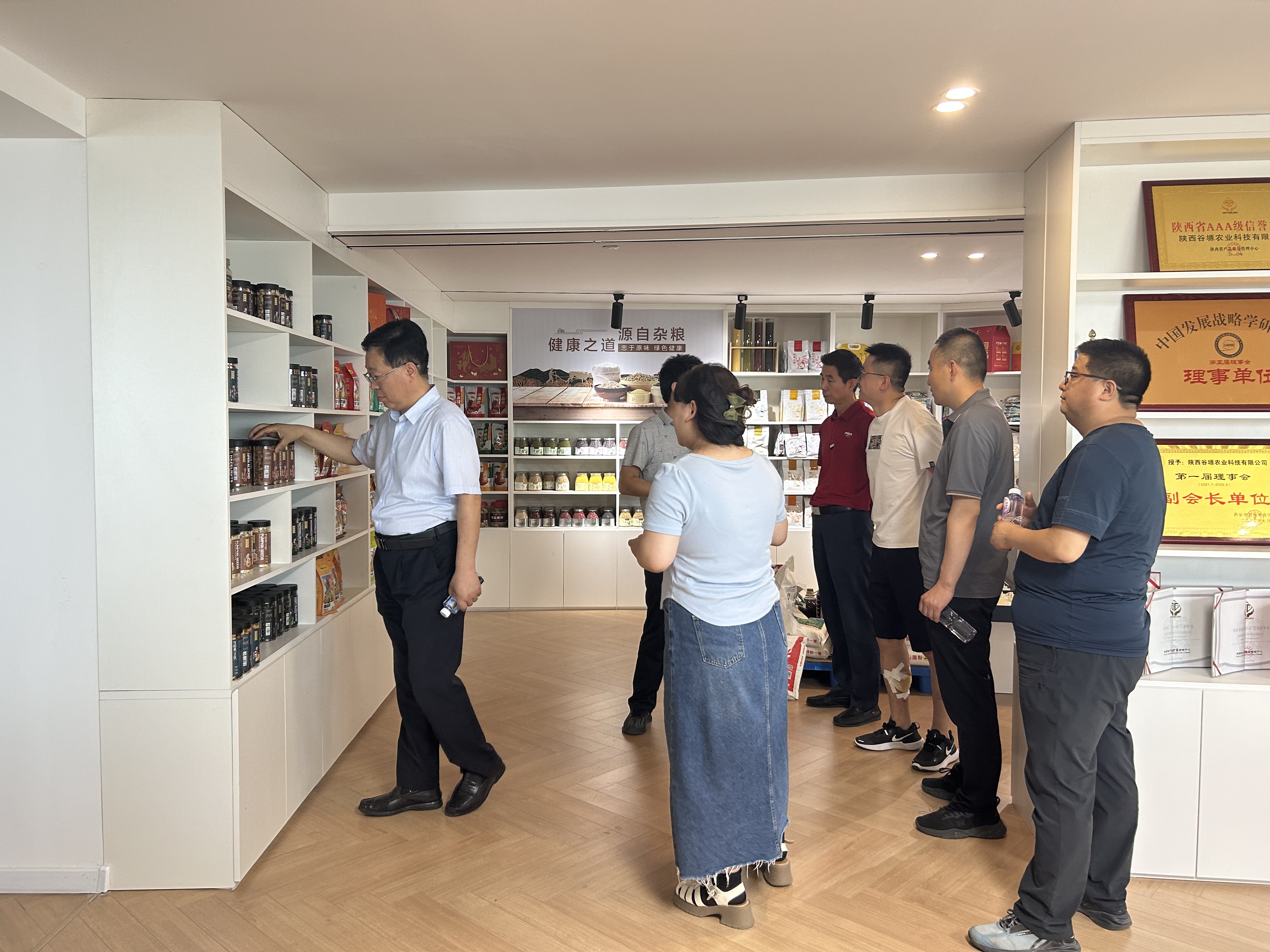 7月16日,正宁县工商联主席范英民(左4)一行到陕西谷塬农业科技有限公司走访调研, 西安市正宁商会会长赵军民,秘书长路健刚(左3)等陪同开展调研工作。西安谷塬食品加工有限公司总经理梁博(左1)全程陪同并亲自讲解交流。